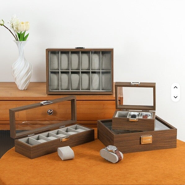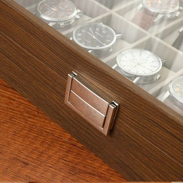 De combinatie van een elegante houten afwerking en een transparante deksel zorgt ervoor dat je horloges altijd zichtbaar zijn, terwijl ze veilig liggen opgeborgen. De zachte, fluwelen kussens beschermen elk horloge tegen krassen en houden ze stevig op hun plek.