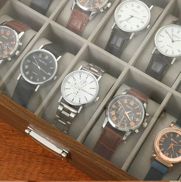 De combinatie van een elegante houten afwerking en een transparante deksel zorgt ervoor dat je horloges altijd zichtbaar zijn, terwijl ze veilig liggen opgeborgen. De zachte, fluwelen kussens beschermen elk horloge tegen krassen en houden ze stevig op hun plek.