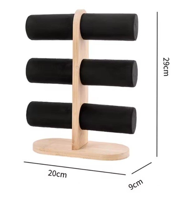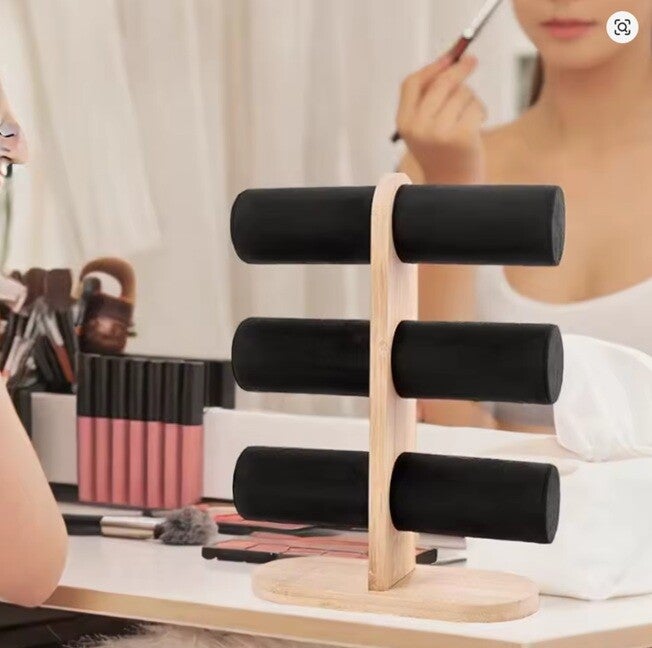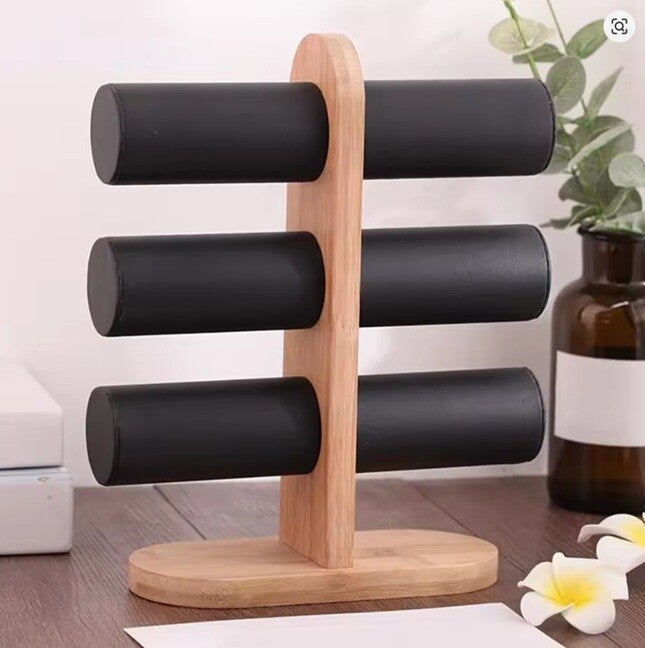 Dankzij de zachte, zwarte PU lederen kussens blijven horloges en armbanden beschermd tegen krassen en slijtage. De stevige houten standaard zorgt voor stabiliteit en een luxe uitstraling, waardoor deze houder niet alleen praktisch is, maar ook een echte eyecatcher op je dressoir, nachtkastje of in de winkel.